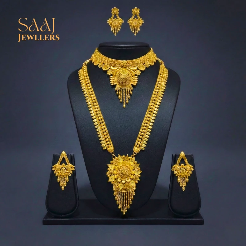 চোকারের মাঝখানের সূক্ষ্ম মোটিফ ও ঝুলন্ত ডিটেইলিং সেটটির ট্র্যাডিশনাল চরিত্রকে আরও ফুটিয়ে তোলে। নিচের লং নেকলেসে থাকা বড় স্টেটমেন্ট পেনড্যান্টটি এই সেটের মূল আকর্ষণ—শার্প কাট ডিজাইন, হেভি কারুকাজ ও ফ্লোইং ঝুলন্ত ফিনিশ একসাথে মিলে একে করেছে নজরকাড়া ও রাজকীয়। সাথে থাকা ম্যাচিং ইয়াররিংস পুরো সেটের সাথে পারফেক্ট কম্বিনেশনে লুককে করে আরও এলিভেটেড। এই কারণেই সেটটি Semi-Bridal Category-তে রাখাই সবচেয়ে স্মার্ট চয়েস।